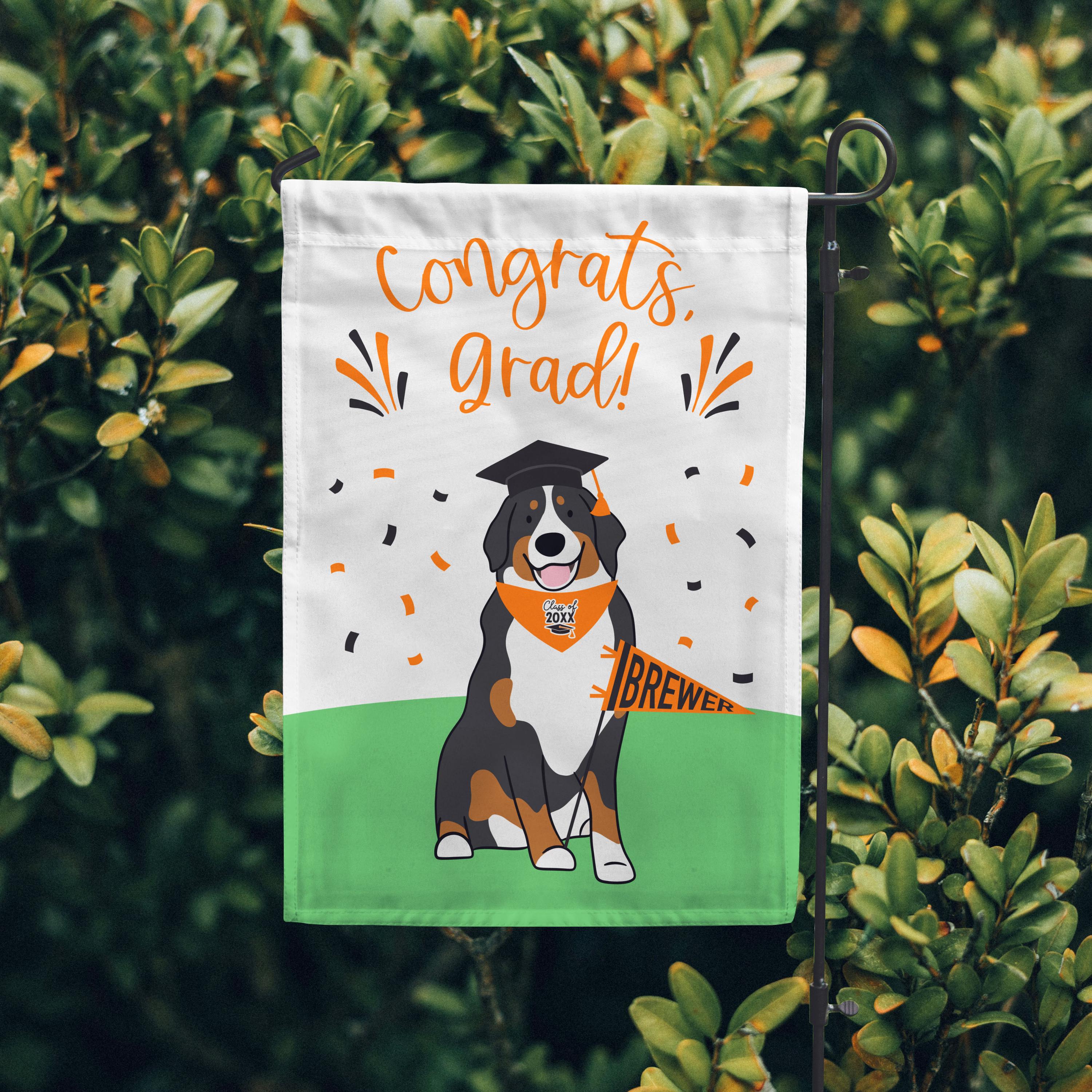 Make your yard the talk of the neighborhood with our personalized Bernese Mountain Dog graduation garden flag! Choose your school colors and accessories to create a flag that perfectly represents your furry family member and your school pride. Made with durable, weather-resistant fabric, this charming flag will brighten your yard, garden, or porch all season long.