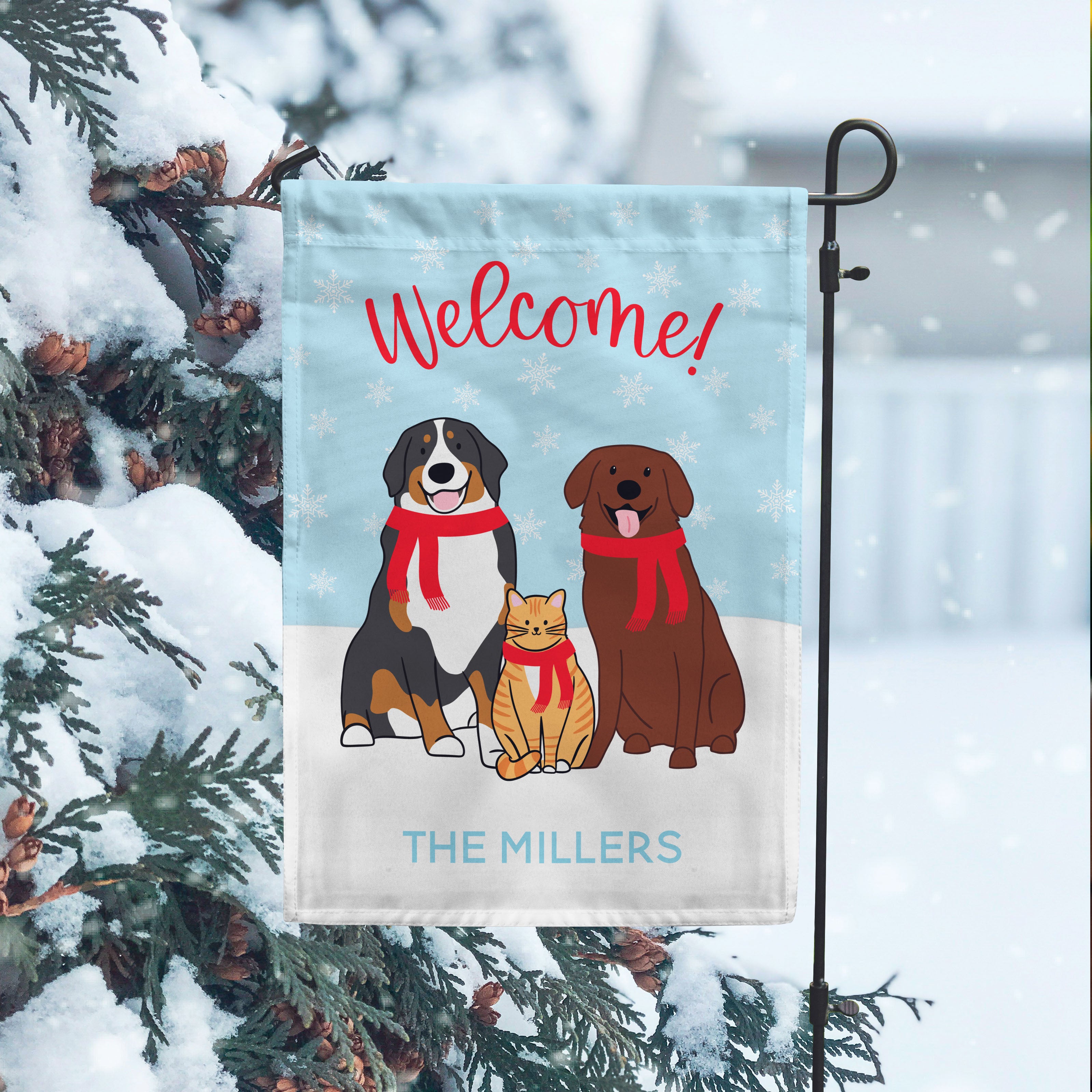 Transform your outdoor space into a winter wonderland with this personalized garden flag featuring your favorite furry friends! Choose from a variety of dog and cat breeds to create a heartwarming design featuring your favorite four-legged companions. Made with durable, weather-resistant fabric, this charming flag will brighten your yard, garden, or porch all season long.